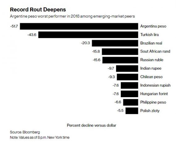 V pretekoch o najslabšiu menu v tomto roku po najväčšom výplachu od uvoľnenia kurzu meny v decembri 2015 prebralo opäť od tureckej líry prvenstvo argentínske peso. To aktuálne stráca medziročne zhruba 50%, pri líre je to niečo cez 40%. Klesajú aj ďalšie emerging markets meny, na tieto dve sa však ani zďaleka nechytajú.