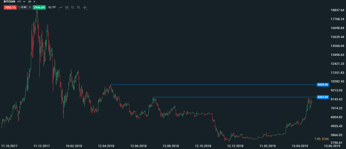 Co čeká na BTC nyní? Klíčová se zdá být resistence nad 8 400 USD, která je maximem z loňského července. Podaří-li se překonat i tuto úroveň, další na řadě je resistence těsně pod 10 tis. USD