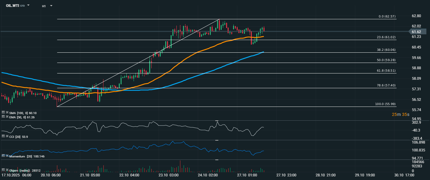 Cena ropy WTI sa aktuálne pohybuje na úrovni 61,62 USD, čím sa obchoduje nad kľúčovou 23,6 % Fibonacciho úrovňou (61,02 USD). Z krátkodobého pohľadu došlo k stabilizácii po predchádzajúcej korekcii z maxím na úrovni 62,57 USD, pričom cena zostáva nad kĺzavým priemerom SMA 100 (60,10 USD) a znovu sa dostala nad EMA 50 (61,26 USD). Tento vývoj môže naznačovať obnovený býčí záujem o ďalší rast. CCI zostáva v pozitívnom pásme (hodnota 53,9), no zatiaľ nevysiela prekúpený signál. Objem obchodov ostáva relatívne stabilný, bez extrémnych výkyvov.