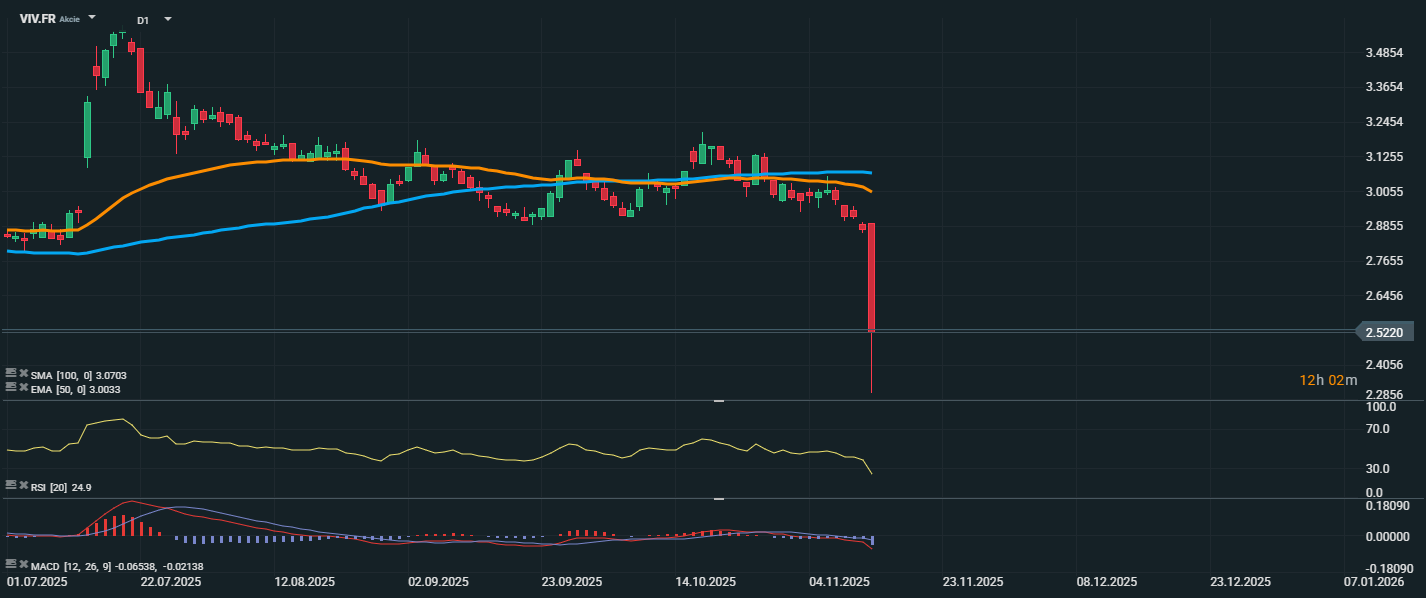Akcie spoločnosti Vivendi dnes zaznamenali prudký výpredaj, keď počas jediného dňa prepadli hlboko pod hranicu 2,40 EUR. Aktuálne sa cena akcií pohybuje mierne vyššie, okolo úrovne 2,5220 EUR. Z technického hľadiska akcie prerazili pod oba kĺzavé priemery – EMA 50 (3,0033 EUR) aj SMA 100 (3,0703 EUR) – čo potvrdzuje výrazné narušenie predchádzajúcej podpory a otvára priestor pre ďalšie oslabenie. RSI klesol na 24,9, čo indikuje, že akcie sú v hlboko prepredanej zóne.