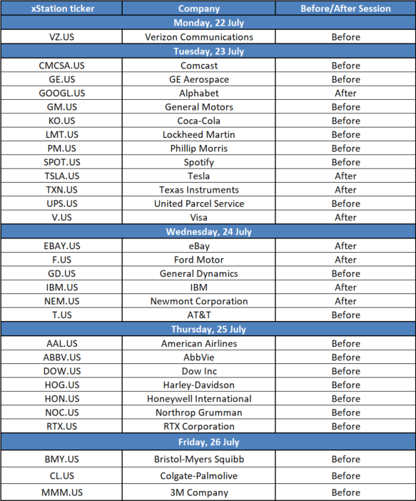 Začal sa nový týždeň, na ktorý mnohí investori na Wall Street čakali. Obchodníci budú mať v najbližších dňoch k dispozícii prvé správy od amerických veľkých technologických spoločností. Hlavným bodom tohto týždňa je utorok, keď po skončení americkej burzovej seansy zverejnia svoje finančné výsledky za 2. štvrťrok spoločnosti Alphabet a Tesla. Tento týždeň však bude výsledky vykazovať aj viacero ďalších známych spoločností vrátane 7 členov indexu Dow Jones.