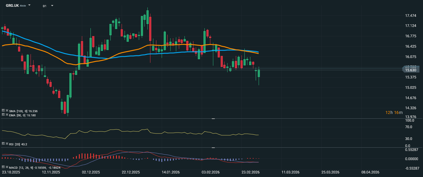Akcie spoločnosti Greggs sa aktuálne obchodujú okolo 15,63 GBP a nachádzajú sa pod kĺzavými priemermi EMA 50 (16,18 GBP) aj SMA 100 (16,24 GBP). Po predchádzajúcom pokuse o stabilizáciu cena opäť zamierila nadol a vytvára sériu nižších maxím. Oblasť okolo 16,20 GBP teraz predstavuje kľúčovú rezistenciu, kde sa zbiehajú oba sledované kĺzavé priemery. Kým sa akcie nevrátia nad túto úroveň, zostáva technický výhlaď negatívny. RSI sa pohybuje pod neutrálnou hranicou 50, čo naznačuje pretrvávajúci predajný tlak, avšak bez známok prepredanosti. To znamená, že trh má stále priestor na ďalší pokles.