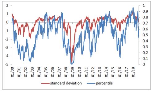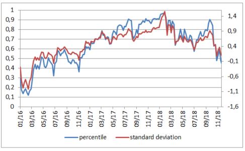 - Percentily (t.j. kde sa aktuálne hodnoty nachádzajú v celkom historickom štatistickom rozdelení dát). V tomto porovnaní je stredná hodnota 0,5, maximum je 1 (historicky najvyššia hodnota o minimum je 0 (historicky najnižšia hodnota)