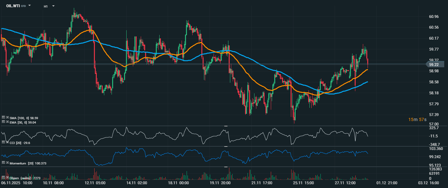 Cena ropy WTI sa aktuálne obchoduje na úrovni 59,22 USD. Po predchádzajúcom poklese došlo k výraznému obratu trendu a cena prerazila nad kĺzavé priemery EMA 50 (59,04 USD) aj SMA 100 (58,59 USD), čo signalizuje zmenu krátkodobého sentimentu na býčí. Momentum je na úrovni 100,4, čo potvrdzuje rastúcu nákupnú dynamiku. Naopak CCI sa nachádza na -29,6, čo naznačuje mierne oslabenie po predchádzajúcom prudkom raste, ale stále zostáva mimo pásma prepredanosti.