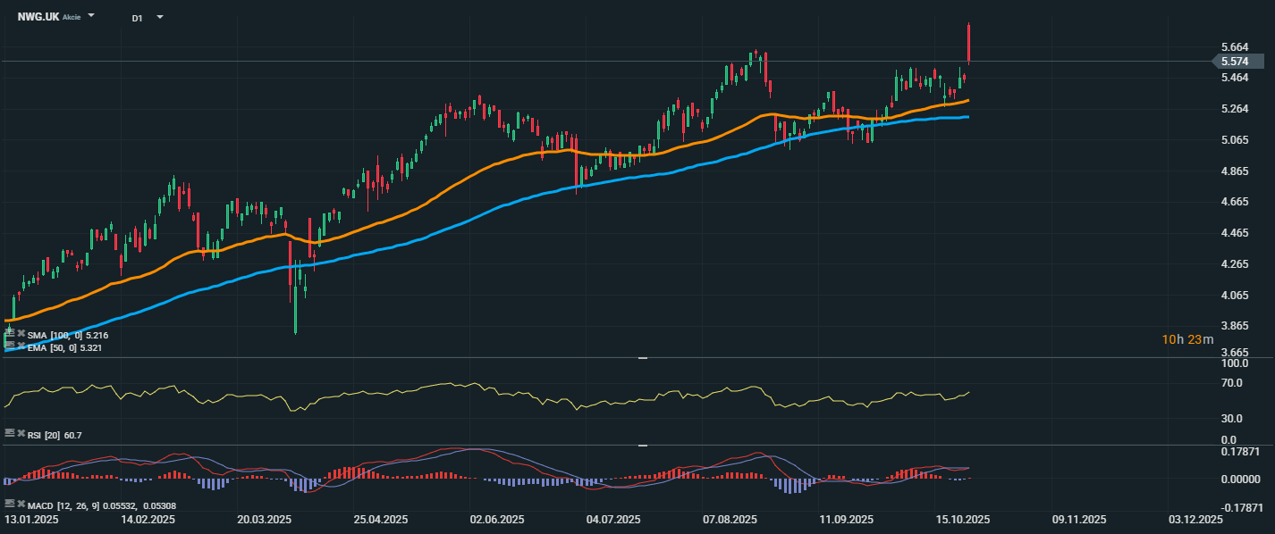 Akcie NatWest Group (NWG.UK) na britskom trhu dnes prudko vyskočili až na 5,66 GBP, čo predstavuje výrazný býčí breakout nad predchádzajúce rezistenčné úrovne.