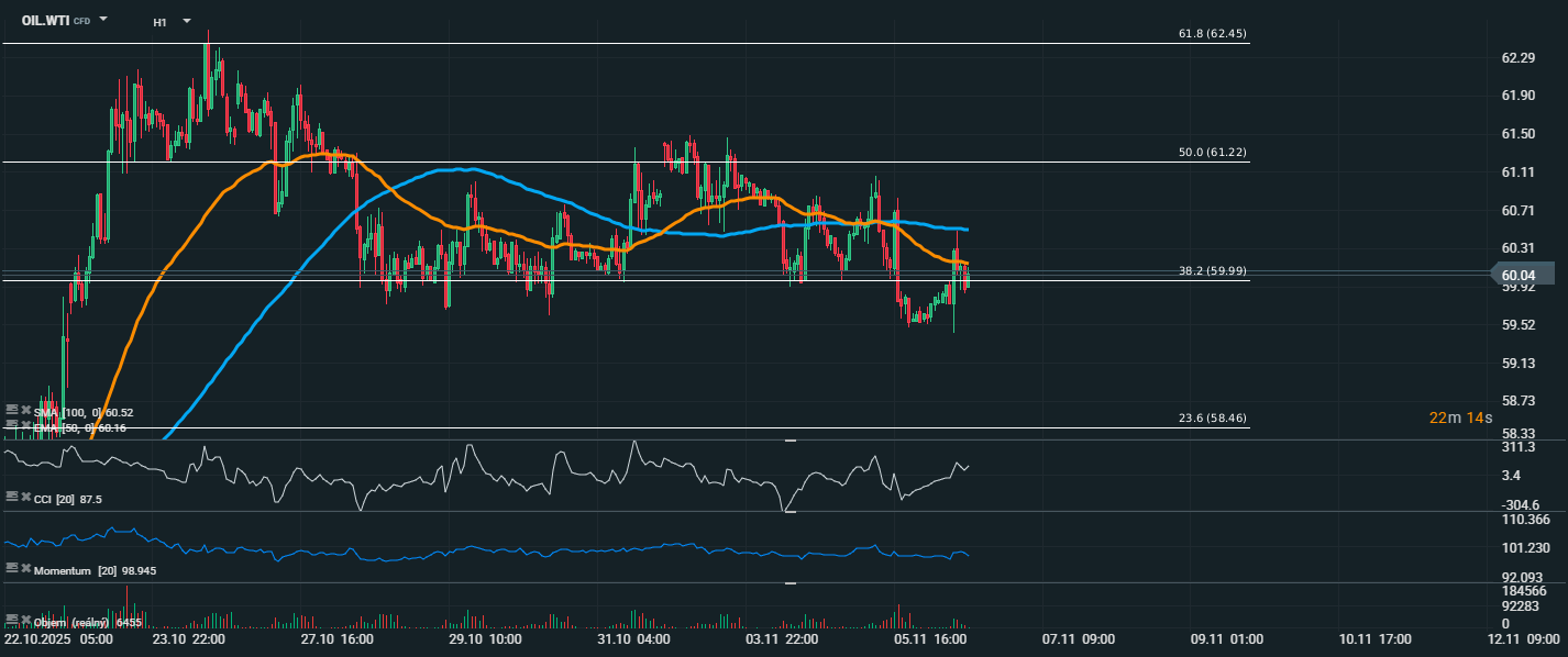Cena ropy WTI sa po včerajšom poklese snaží stabilizovať v blízkosti Fibonacciho hladiny 38,2 % na úrovni 59,99 USD, aktuálne sa obchoduje za 60,04 USD. Tento cenový bod predstavuje kľúčovú krátkodobú rezistenciu, keďže sa tu nachádza aj klzavý priemer EMA 50 (60,18 USD), ktorý bol v posledných dňoch viackrát testovaný a odmietnutý.
