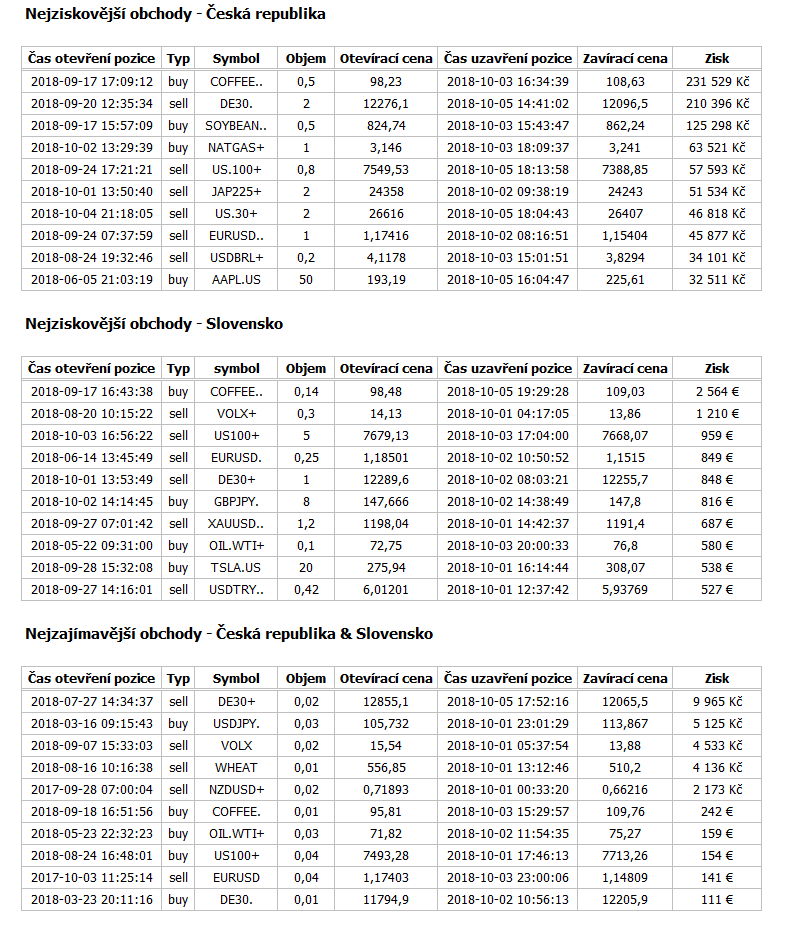 Tabulky: nejlepší obchody týdne na uvedených instrumentech