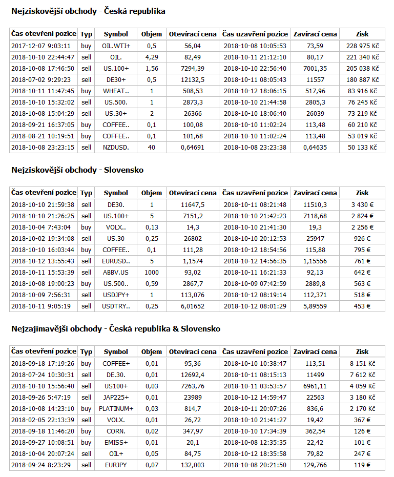 Tabulky: Nejlepší obchody týdne na uvedených instrumentech