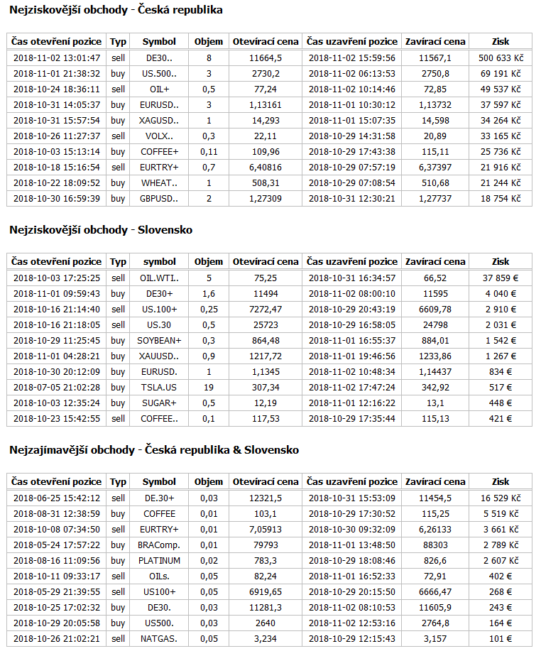 Obchod s nejvyšším ziskem na reálných účtech ve famózní výši 37 859 euro realizoval obchodník ze Slovenska na americké ropě WTI. Prodejní pozici o velikosti 5 lotů zobchodoval během měsíce října. Vstup proběhl dne 3. října na úrovni 75,25 USD/bbl a realizace pozice se udála na úrovni 66,52 USD/bbl. Celkový pohyb trhu ve prospěch obchodu se vyšplhal na 8,73 dolarů.