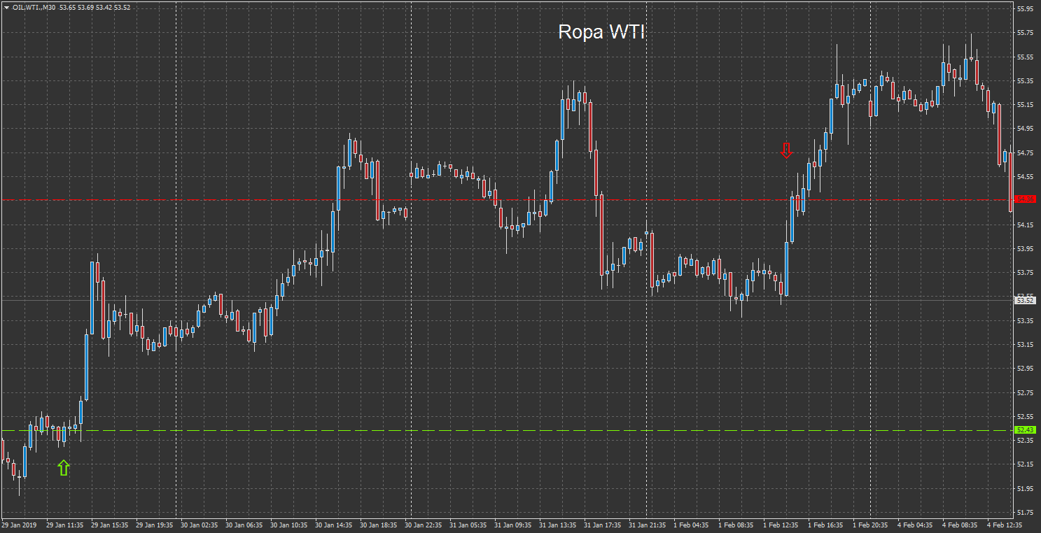 Do čela nejlepších obchodů na reálných účtech XTB se v minulém týdne dostala americká ropa WTI. Slovenský obchodník vstoupil do long pozice 29. ledna na úrovni 52,43 dolarů za barel. K realizaci pozice došlo 2. února na ceně 54,36 dolarů za barel. Díky objemu obchodu o velikosti 8 lotů si obchodník vydělal báječných 13 404 euro. Pohyb instrumentu ve prospěch obchodníka dosáhl na 1 dolar a 93 centů.