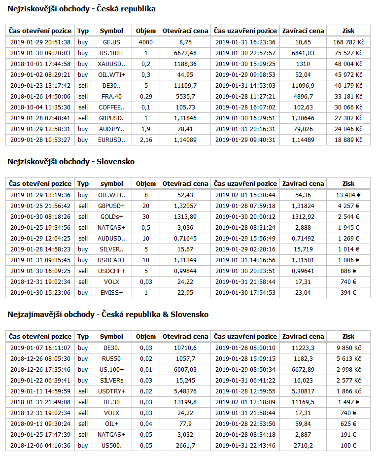 V Česku se nejvíce vydělávalo na akciích. Díky nákupu 4 000 kusů akcií společnosti General Electric (GE.USD) si obchodník přišel na excelentních takřka 169 tisíc korun. Do obchodu vstoupil 29. ledna na ceně 8,75 dolarů za akcii. Akcie prodal hned 31. ledna na ceně 10,65 dolarů za akcii. Pohyb ceny akcie ve prospěch obchodníka dosáhl na 1 dolar a 90 centů.