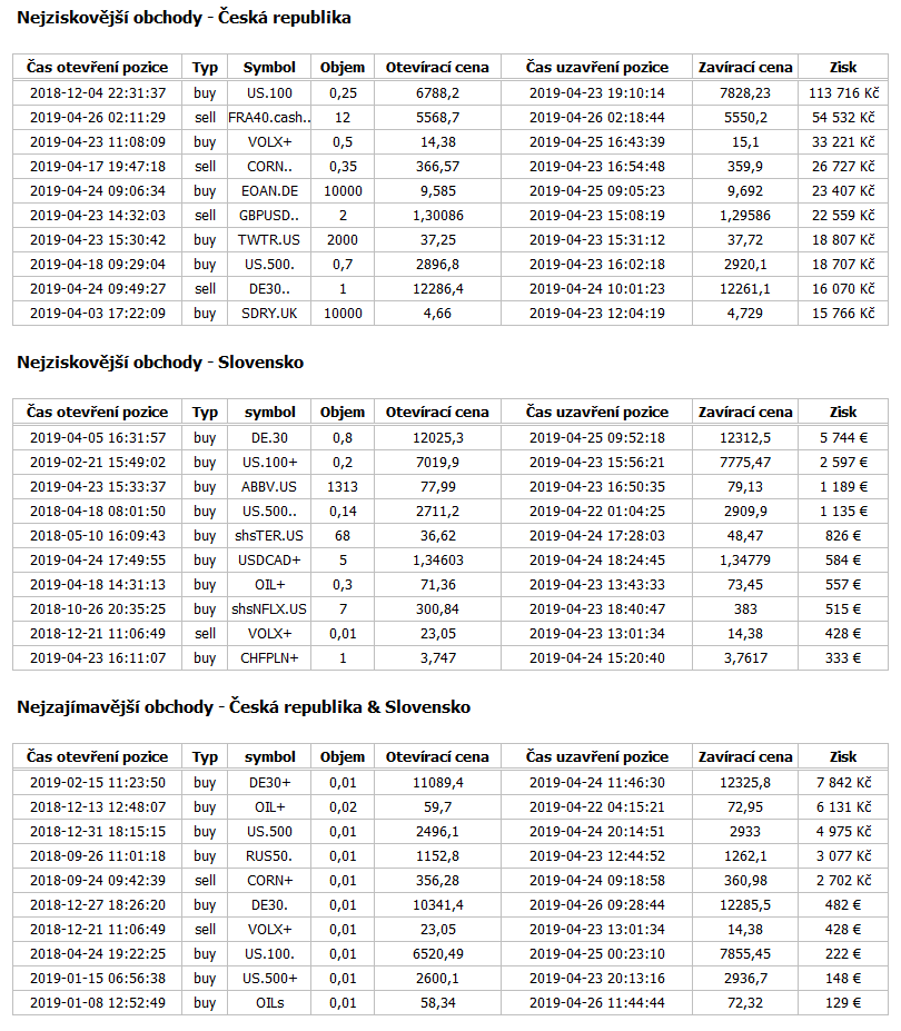 Tabulky: Nejlepší obchody na uvedených instrumentech