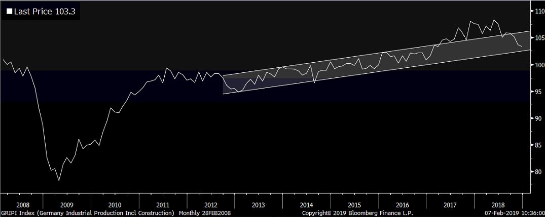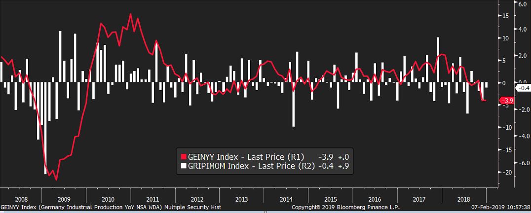 Nemecko pokračuje vo vykazovaní zlých čísel. Priemyselná výroba klesla v decembri o 0,4% (čakal sa pritom rast o 0,8%). Medziročný pokles ostal na úrovni 3,9%, čo je najviac od finančnej krízy (je však potrebné povedať, že vtedy klesala priemyselná výroba o viac ako 20%). Je to však o niečo viac ako počas dlhovej krízy.