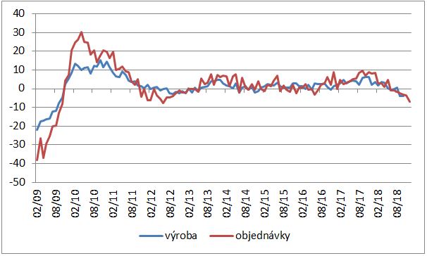 Vývoj medziročnej zmeny priemyselnej výroby a priemyselných objednávok