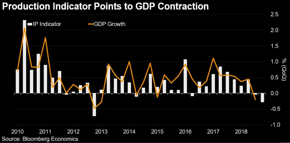 Keď aktuálny vývoj priemyselnej výroby porovnáme s HDP, tak to vyzerá, že aj posledný kvartál v roku bude slabší. A keďže tretí kvartál ukázal pokles, tak by ďalší pokles znamenal naplnenie podmienok technickej recesie.