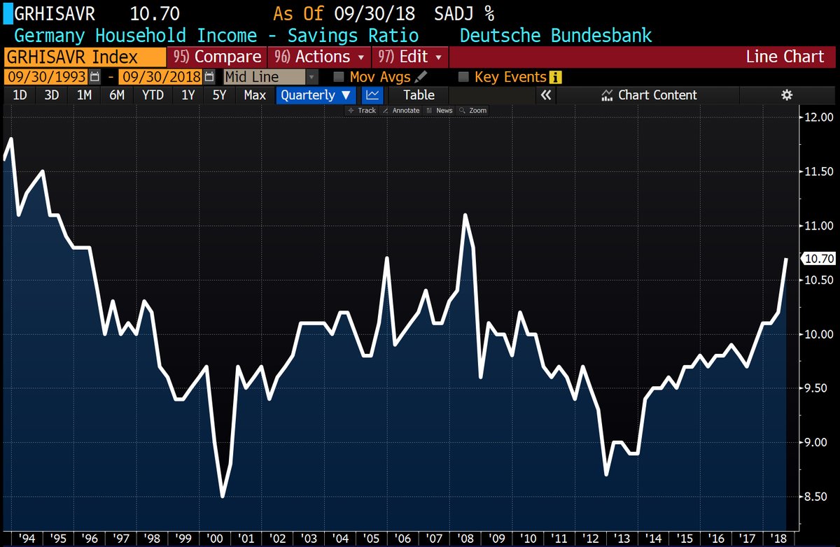Ďalším zaujímavým číslom z Nemeckej ekonomiky je prudký rast miery úspor. Aktuálne je ťažké povedať, či to je dobrá alebo zlá správa. Na jednej strane viac úspor znamená väčšiu odolnosť domácností voči šokom, na druhej strane je to však znakom slabšej spotreby. Kľúčové je, že či miera úspor rástla kvôli rýchlejšiemu rastu miezd (prípadne niečomu inému) alebo kvôli obavám o budúci vývoj (vysoká spotrebiteľská dôvera naznačuje, že druhá možnosť je menej pravdepodobným vysvetlením).
