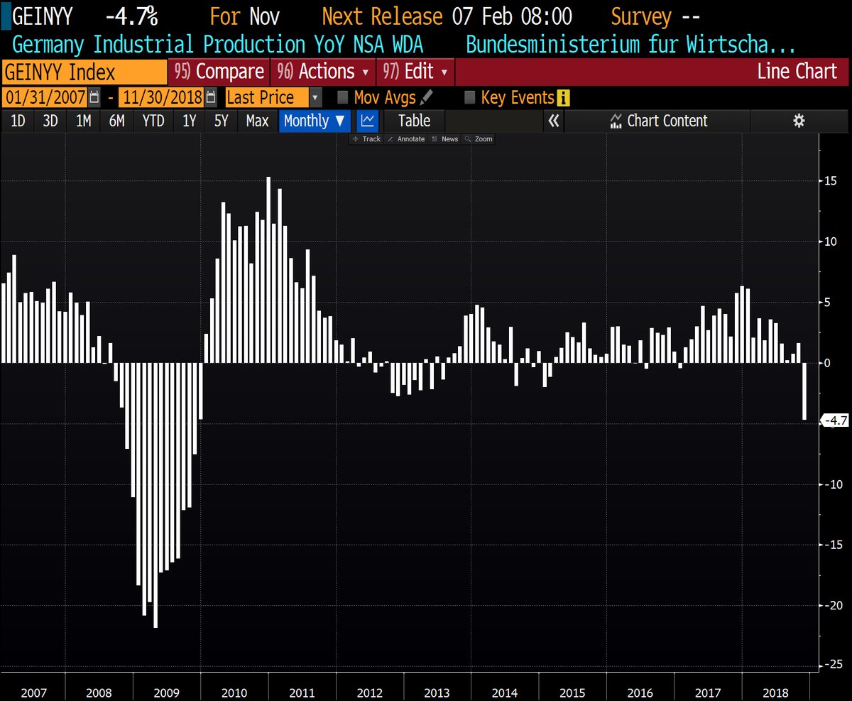 Slabšie čísla z Nemecka pokračujú. V novembri klesla priemyselná výroba medzimesačne o 1,9% (čakal sa pritom rast o 0,3%). V medziročnom porovnaní to dokonca predstavuje prepad o 4,7%, ktorý je podstatne vyšší ako počas dlhovej krízy.