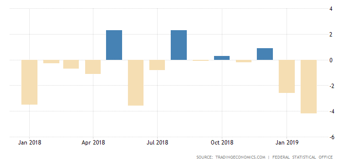 Německo dnes ráno zveřejnilo výsledky továrních objednávek, které daly obchodníkům další důvod k nervozitě. Objednávky se totiž v únoru propadly o 4,2 %, což byl nejhorší výsledek od začátku roku 2017. Co je možná ještě horší je ale skutečnost, že takto prudký pád následoval po již tak špatných lednových číslech, kdy objednávky klesly o 2,6 %.