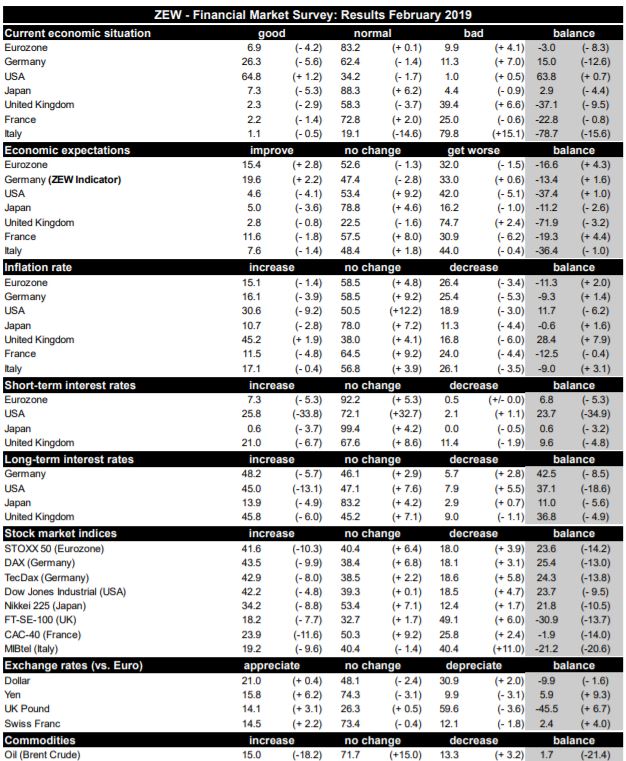 Detailné výsledky prieskumu ZEW – konečný index je v predposlednom stĺpci, v poslednom je hodnota spred mesiaca