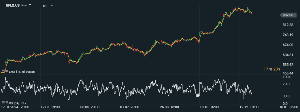 Graf znázorňuje vývoj akcií Netflixu v roku 2024. Žltá čiara (EMA 14) ukazuje stabilný rast. Spodný panel s RSI naznačuje, či sú akcie prekúpené (nad 70) alebo prepredané (pod 30). Graf odráža silný rast Netflixu, podporený športovými prenosmi, partnerstvami a rastúcim počtom predplatiteľov. Zdroj: xStation5