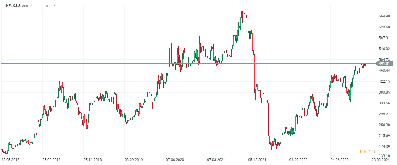 Akcie Netflixu sa stále obchodujú o viac ako 40 % pod svojimi maximami z roku 2021. Dokázali sa odraziť od svojich minim z leta 2022 o viac ako 200 %.