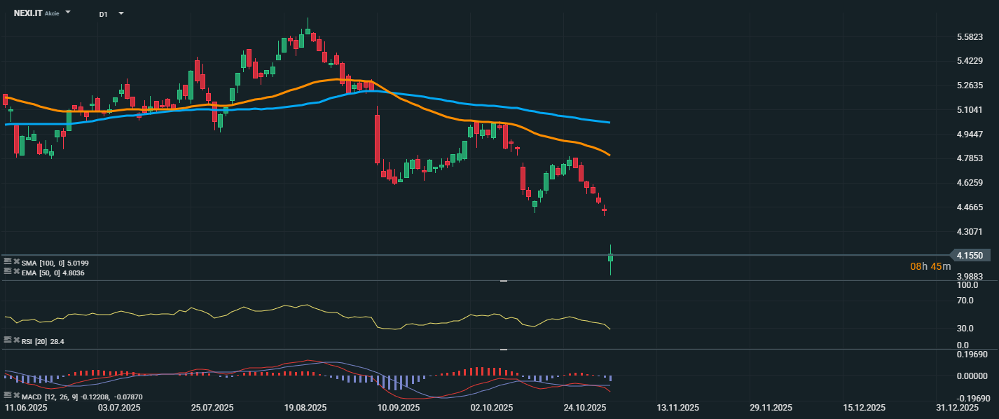 Akcie spoločnosti Nexi sa nachádzajú v silnom zostupnom trende a aktuálne sa obchodujú za 4,155 EUR. Cena sa drží výrazne pod kĺzavými priemermi EMA 50 (4,803 EUR) a SMA 100 (5,019 EUR), čo potvrdzuje silný medvedí trend. RSI klesol na úroveň 28,4, čo signalizuje prepredaný trh, a teda možnosť krátkodobého technického odrazu. Na potvrdenie akéhokoľvek obratu by musela cena prekonať úroveň 4,50 EUR a následne aj 4,80 EUR, kde sa nachádza dôležitý kĺzavý priemer EMA 50.