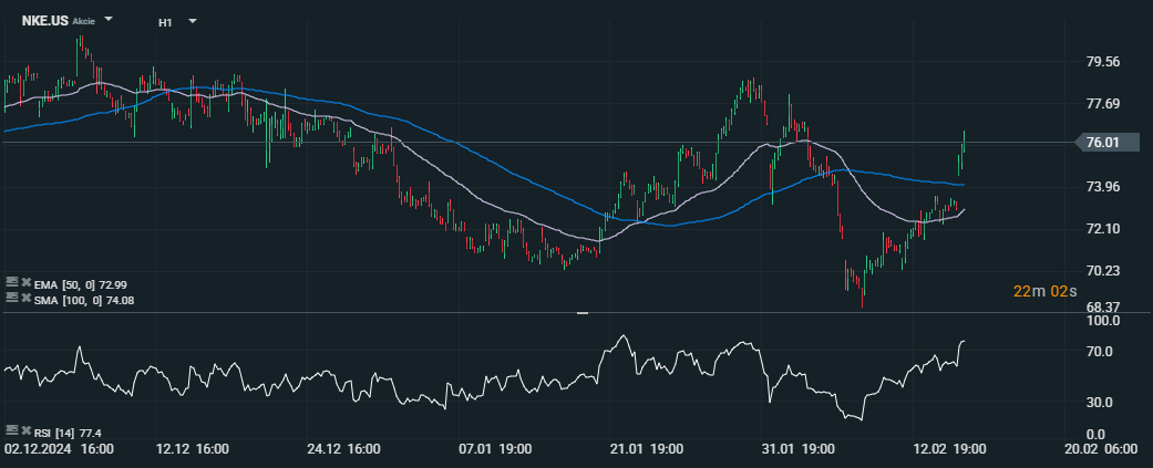Graf ukazuje pohyb akcií Nike (NKE.US) na hodinovom grafe, kde po oznámení spolupráce so Skims došlo k rastu na 76 USD. Medzi použité indikátory patrí exponenciálny klzavý priemer (EMA 50) – sivá čiara, zobrazujúci krátkodobý trend (72,99), jednoduchý klzavý priemer (SMA 100) – modrá čiara, reflektujúci dlhodobejší trend (74,08), a index relatívnej sily (RSI) – biela krivka, ktorý pri hodnote 77,4 signalizuje prekúpený trh. Zdroj: xStation5
