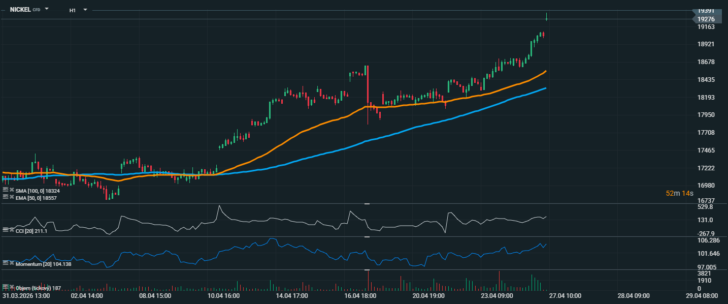 Cena niklu pokračuje v silnom rastovom trende a aktuálne sa pohybuje okolo úrovne 19 276 USD za tonu. Trh sa drží výrazne nad kĺzavými priemermi, konkrétne nad EMA 50 na hodnote 18 557 USD aj nad SMA 100 na úrovni 18 324 USD, čo potvrdzuje jasnú prevahu kupcov. Rast navyše výrazne zrýchlil a cena sa dostala až do blízkosti lokálnej rezistencie okolo 19 391 USD. CCI sa nachádza na hodnote 211,1, teda hlboko v prekúpenej oblasti. To ukazuje na veľmi silné rastové momentum, ale zároveň zvyšuje riziko krátkodobého výberu ziskov. Momentum na hodnote 104,1 tiež potvrdzuje pokračujúcu silu trendu a naznačuje, že kupci majú trh stále pod kontrolou. Objem obchodov sa v závere rastu zvýšil, čo podporuje dôveru v aktuálny preraz smerom nahor.