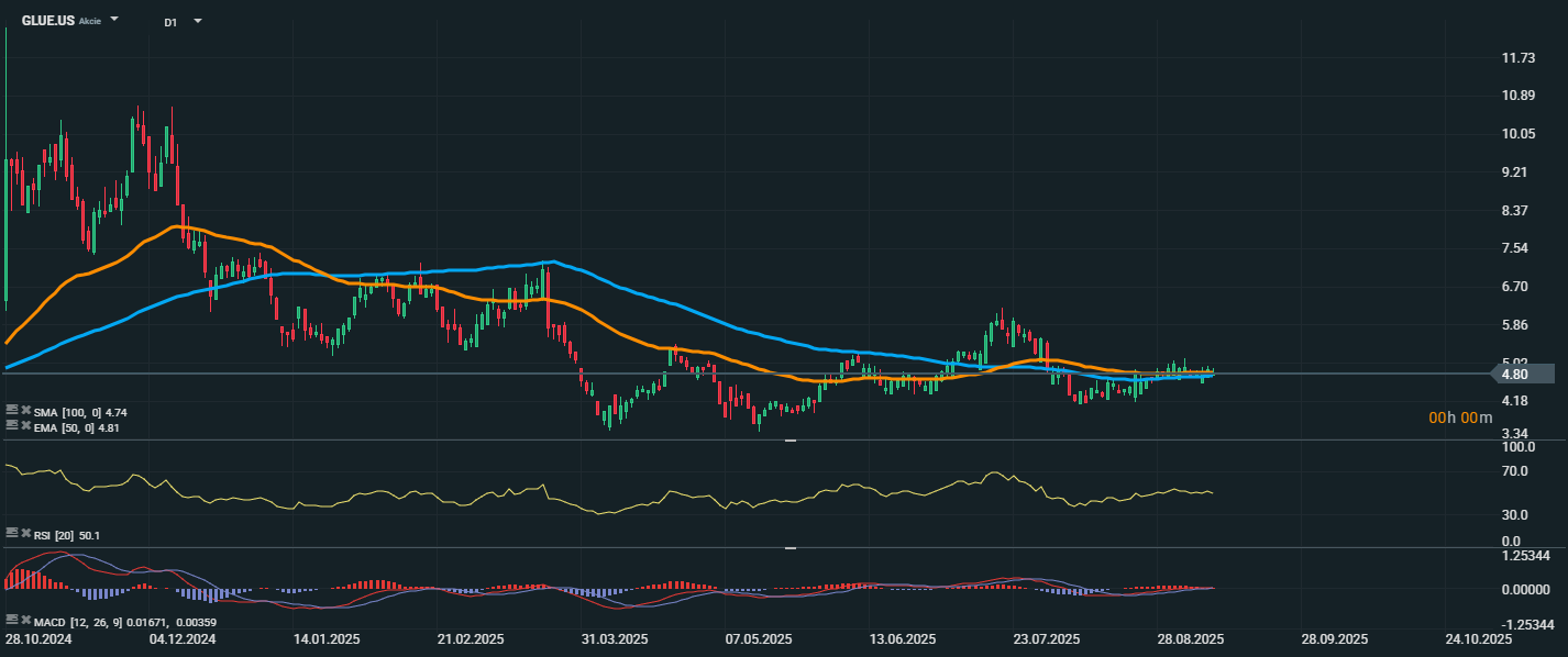 Akcie spoločnosti Monte Rosa Therapeutics (GLUE.US) sa po dlhšom období poklesu stabilizujú okolo ceny 4,80 USD. Z technického pohľadu sa akcie pohybujú priamo na úrovni EMA 50 (4,81 USD) a zároveň nad SMA 100 (4,74 USD), čo vytvára neutrálne až mierne býčie technické nastavenie.