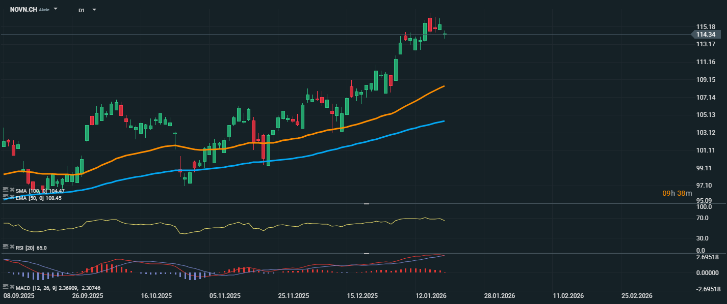 Akcie Novartis pokračujú v rastovom trende a aktuálne sa obchodujú na úrovni 114,34 CHF, len mierne pod nedávno dosiahnutým historickým maximom 115,18 CHF. Cena sa drží výrazne nad kĺzavými priemermi – EMA 50 (108,45 CHF) a SMA 100 (104,47 CHF), čo potvrdzuje stabilné býčie momentum. RSI je na úrovni 65, teda v blízkosti prekúpeného pásma, no stále signalizuje zdravý rast bez známok prehriatia. Krátkodobo môže dôjsť ku konsolidácii alebo výberu ziskov, no ak si akcie udržia podporu nad EMA 50, výhľad zostáva pozitívny.