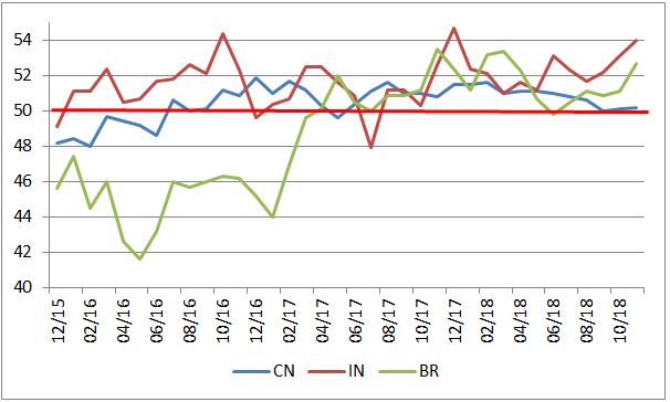 Presuňme sa teraz do sféry rozvíjajúcich sa ekonomík. Čo sa týka troch najväčších, tak v Číne pokračuje už tretí mesiac stagnácia (dôvodom sú obchodné vojny a tlak regulátorov na obmedzovanie tieňového bankovníctva). V Indii a Brazílii sa však nálada zlepšuje a je na najvyšších úrovniach za posledné mesiace. Po problémoch spôsobených vyššími sadzbami v USA a posilnení dolára (ktoré si najviac odniesli Turecko a Argentína), to teda vyzerá na zrýchľovanie rastu.