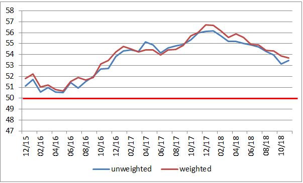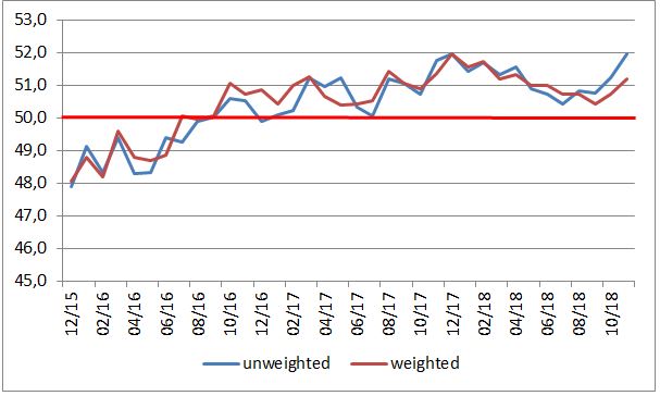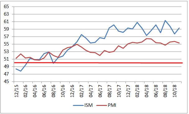 Žiada sa ešte doplniť, že v USA vychádzajú dva takéto indexy. Okrem toho z dielne Markit Economics aj index od Institute for Supply Management. Ten v novembri rástol a udržal si mimoriadne vysoké úrovne. Americká výrobná sféra teda môže byť na tom ešte výrazne lepšie, ako ukazuje index z grafu vyššie.