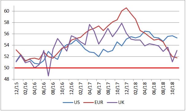 Dnešok bol dňom zverejňovania indexov výrobnej dôvery z väčšiny popredných ekonomík z dielne Markit Economics, ktoré ukazujú v akej fáze cyklu sa aktuálne ekonomiky nachádzajú. Keď sa pozrieme na popredné krajiny, tak v USA ostáva výrobný index vo fáze silnej expanzie. V Británii dokázal po minulomesačnom poklese na viac ako dvojročné minimá len tesne nad úroveň 50b. oddeľujúcu rast v sektore od poklesu, vymazať väčšinu strát. V Eurozóne pokračuje spomalenie, tento krát však len miernejším tempom, klesol však po prvý krát za posledného dva a pol roka pod 52b. Aj naďalej ho ťahajú nadol exporty.