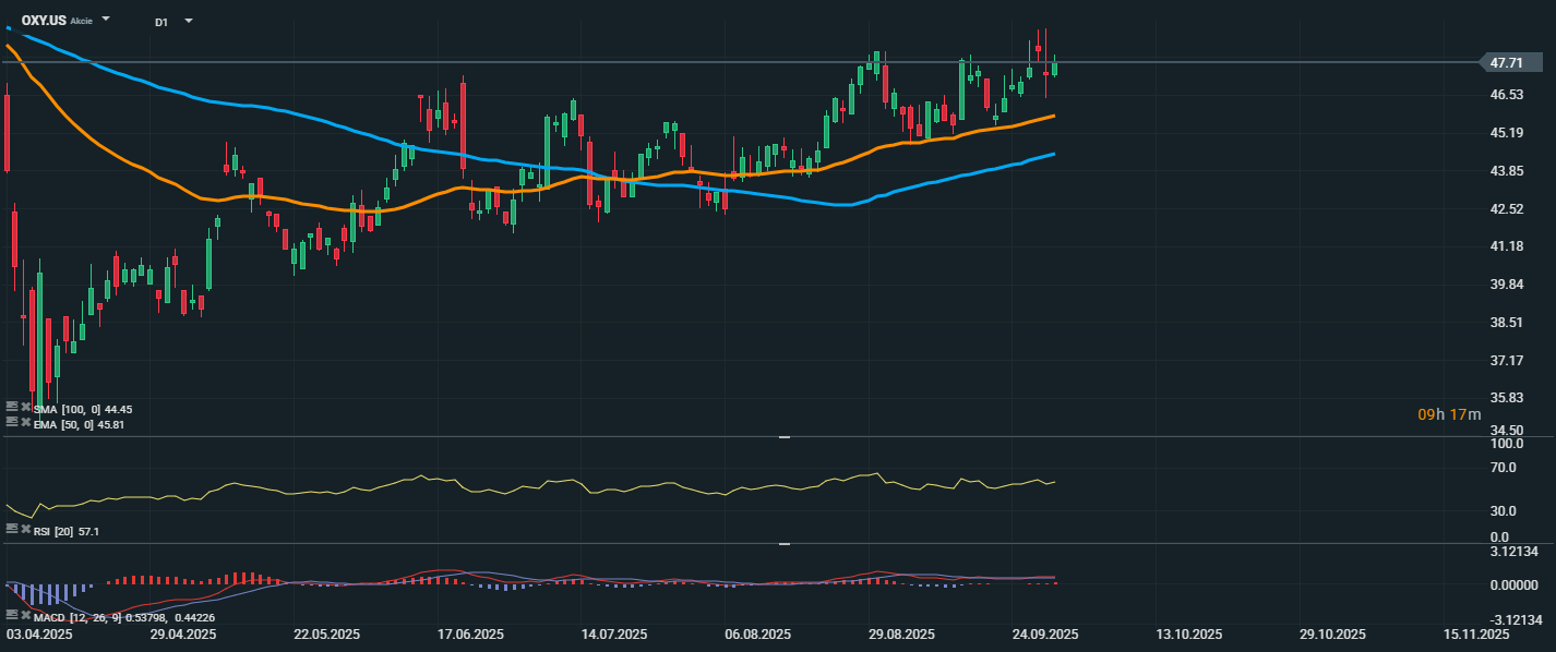 Akcie Occidental Petroleum sa obchodujú na úrovni 47,71 USD. Cena sa pohybuje nad EMA 50 (45,81 USD) aj nad SMA 100 (44,45 USD), čo potvrdzuje stabilné rastové momentum. RSI dosahuje hodnotu 57,1, teda je v neutrálnom pásme so sklonom k býčiemu nastaveniu, čo ukazuje na priestor pre pokračovanie rastu bez rizika prekúpenosti. MACD zostáva nad nulou aj nad signálnou líniou, pričom histogram poukazuje na pozitívne momentum.