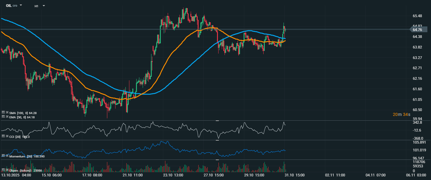 Z pohľadu cenovej štruktúry je zrejmé, že sa trh odrazil z predchádzajúcej konsolidácie, ktorá trvala niekoľko dní. Prieraz nad priemery prichádza po období bočného obchodovania a vytvára priestor pre ďalší rast, pričom ďalší odpor sa nachádza v oblasti 65,50–66,00 USD. Zároveň však CCI varuje pred možným krátkodobým vyčerpaním rastu, a preto nie je možné vylúčiť návrat ku kľúčovej podpore okolo 64,20–64,30 USD, kde sa aktuálne nachádzajú oba kĺzavé priemery.