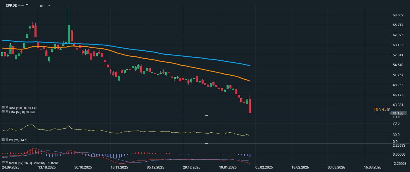Akcie PayPalu dnes zaznamenali prudký výpredaj, keď sa prepadli až na úroveň 41,18 EUR, čo predstavuje nové cenové minimum v rámci súčasného dlhodobého klesajúceho trendu. Cena sa nachádza hlboko pod kĺzavými priemermi EMA 50 (50,05 EUR) a SMA 100 (54,44 EUR), čo potvrdzuje pretrvávajúci medvedí sentiment na trhu. RSI klesol na 24,5, čím sa dostal hlboko do prepredanej zóny, čo môže naznačovať možnosť krátkodobej technickej korekcie alebo spomalenie poklesu. Trh bude v najbližších dňoch pravdepodobne hľadať lokálne dno, avšak bez zásadného zlepšenia sentimentu alebo novej pozitívnej správy zostáva trend jednoznačne negatívny.