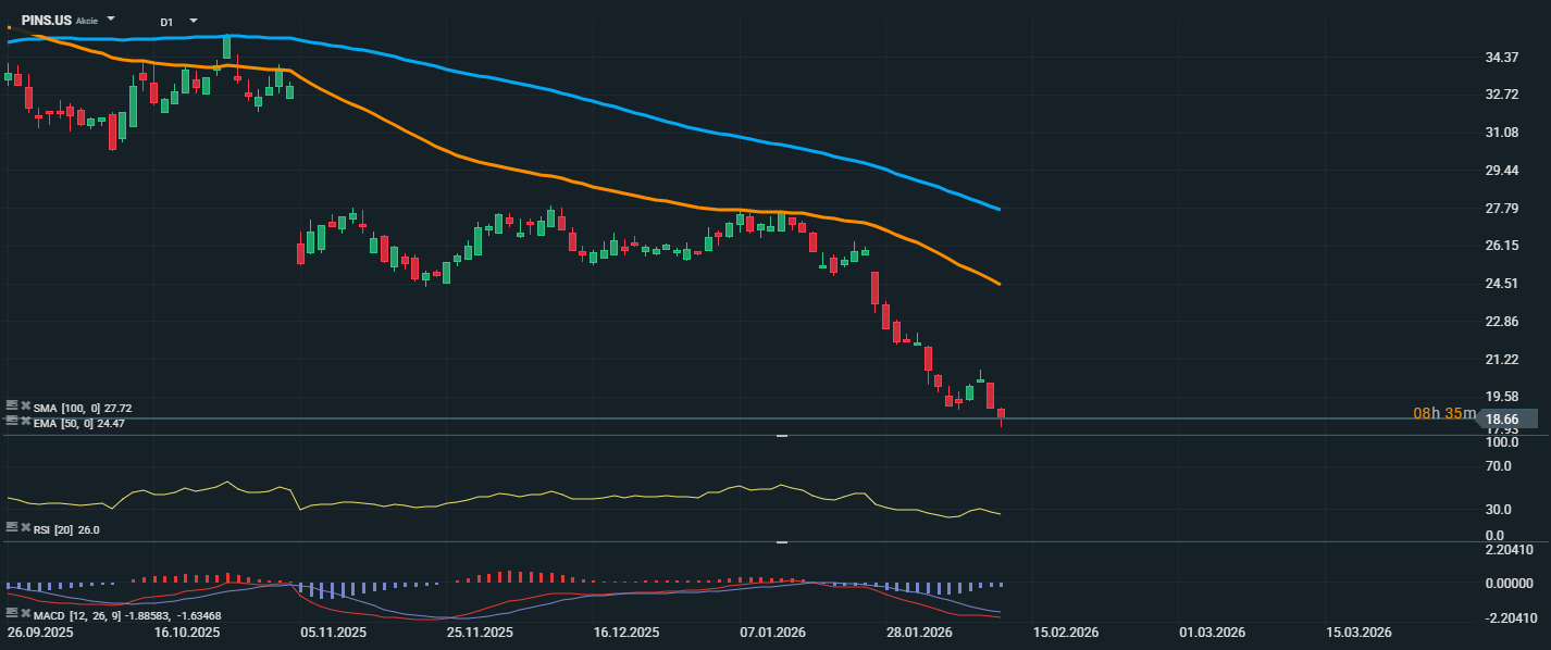 Akcie Pinterestu sa tak blížia k najnižšej úrovni od apríla 2020 a ak predtrhové straty pretrvajú, spoločnosť by mohla stratiť viac ako 2 miliardy USD trhovej kapitalizácie zo svojej súčasnej hodnoty približne 12,5 miliardy USD.
