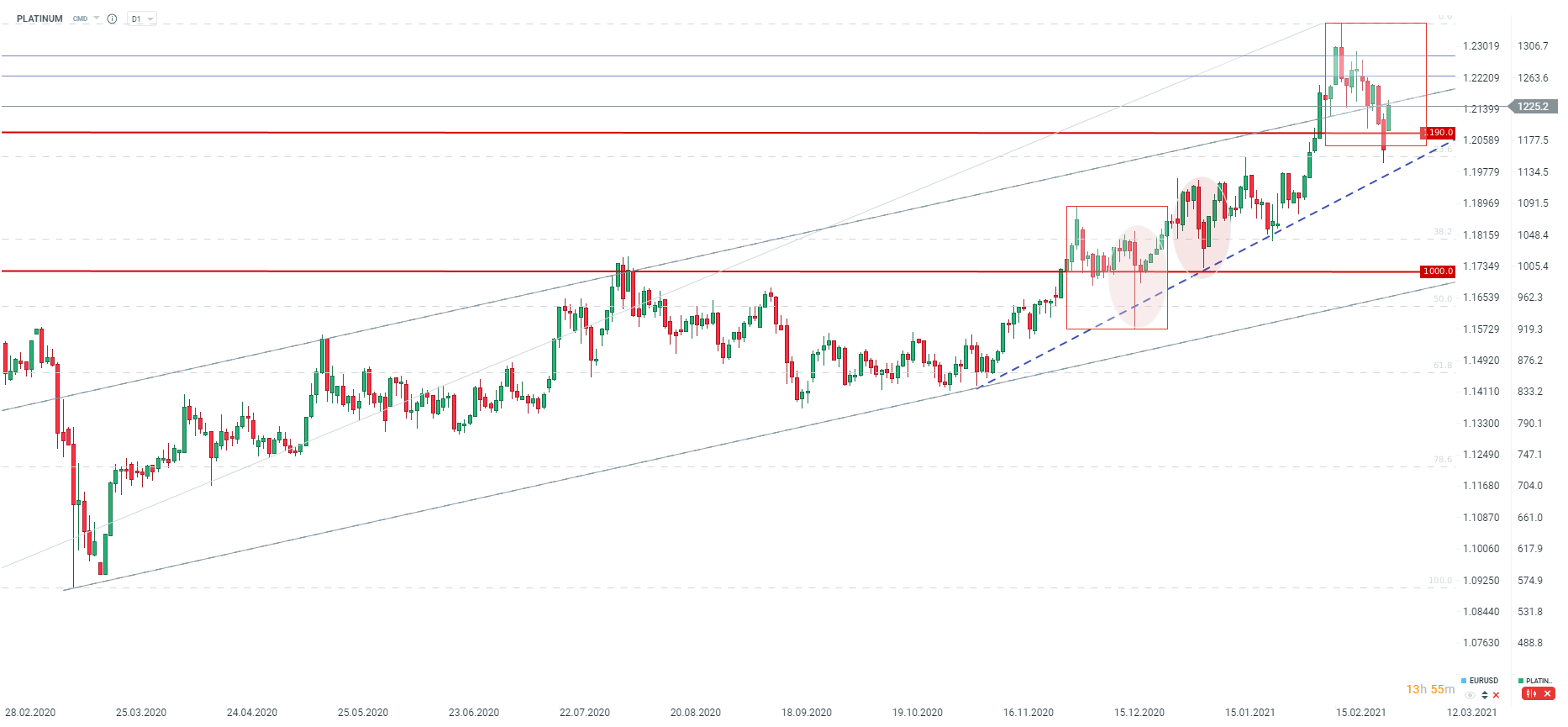 Platina sa odrazila od 23,6% retracementu posledného silného impulzu smerom nahor. Súčasné oživenie vyzerá podobne ako v decembri alebo januári. Po poklese zostáva štruktúra trendu s korekciou rovnakej veľkosti nedotknutá vďaka dnešnému odrazu smerom nahor. Zdroj: xStation5