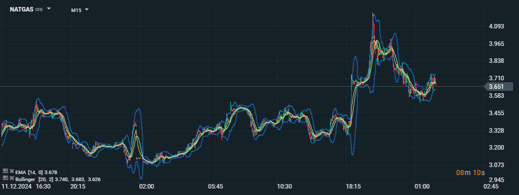 "Kolísanie cien zemného plynu v USA: Počiatočné trendy roku 2025 s EMA a Bollingerovými pásmami" Tento graf znázorňuje pohyb cien zemného plynu v USA s použitím exponenciálneho kĺzavého priemeru (EMA 14) a Bollingerových pásiem (20, 2). Bollingerove pásma ukazujú volatilitu cien, pričom obdobia zúženia striedajú expanzie, zatiaľ čo EMA odhaľuje celkový krátkodobý trend. Zdroj: xStation5