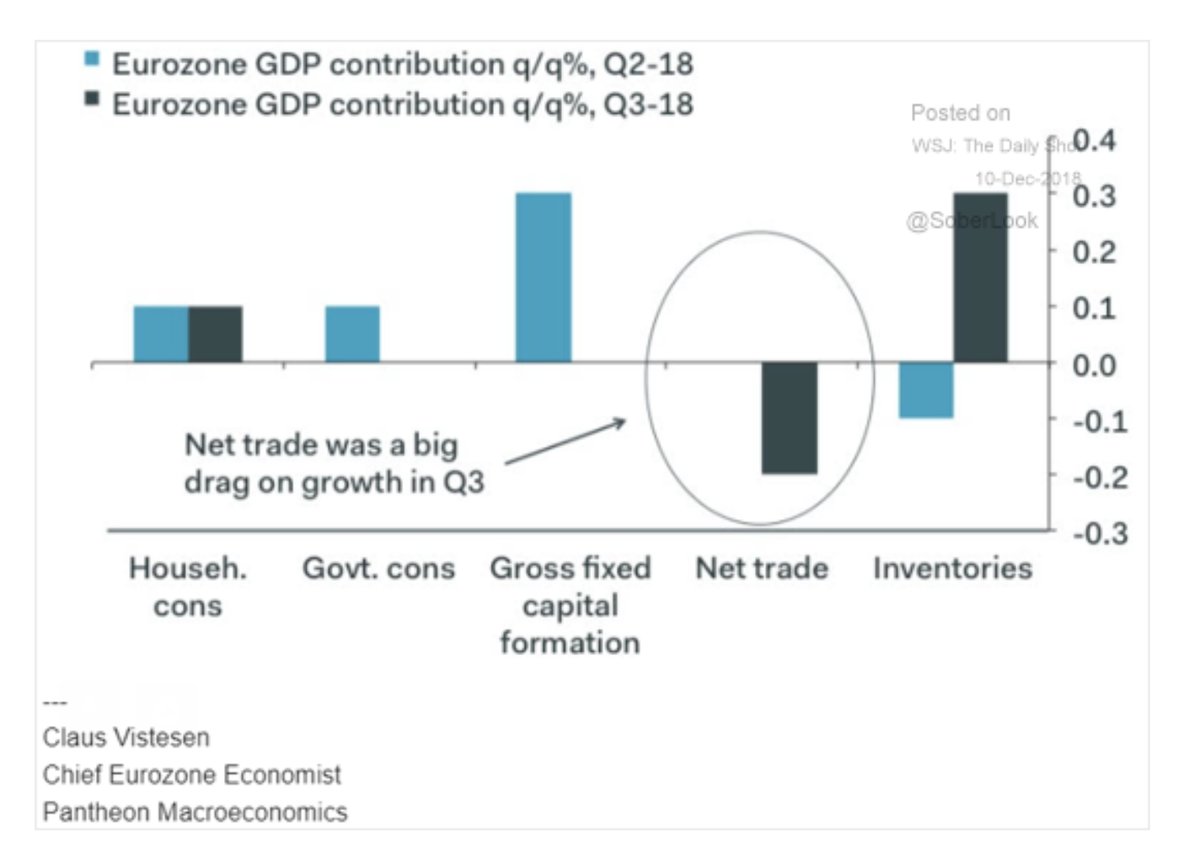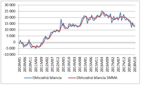 Prebytok na obchodnej bilancii pokračuje v poklese. Nie je to však zlá správa, za veľkú časť nárastu prebytku bol zodpovedný prepad domáceho dopytu po dlhovej kríze, to že má eurozóna vyšší apetít po tovaroch a službách zo zahraničia je pri vysokom prebytku skôr pozitívnym znakom. Trojmesačný kĺzavý priemer obchodného prebytku bol v októbri najnižší od roku 2014.