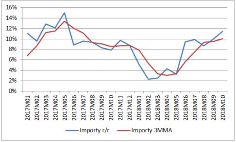 V raste pokračujú aj importy. Čiastočne je to vyššou cenou ropy (čísla sú ešte za október), je to však aj znakom silného domáceho dopytu krajín eurozóny (v dôsledku silného trhu práce a čiastočne aj vládnych výdavkov). Októbrový rast na úrovni 11,5% bol dokonca najvyšší od mája 2017.