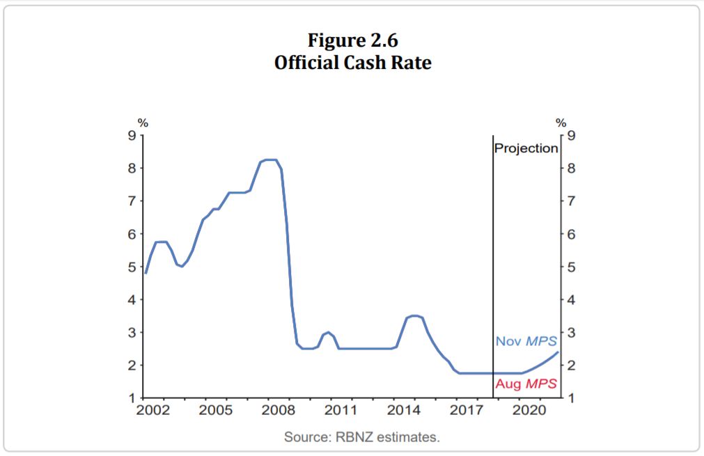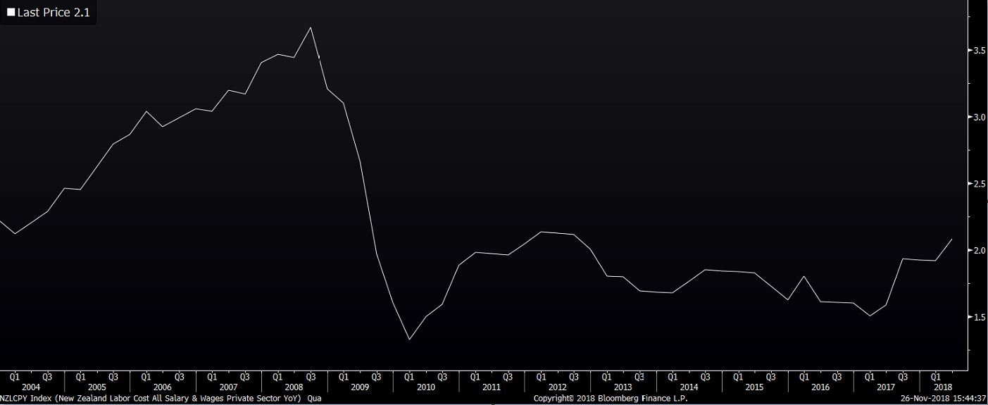 Očakávania, že silnejší trh práce vytlačí nahor mzdy sa vo svete zatiaľ napĺňajú len minimálne (čiastočne v USA, tam však mzdy rastú podstatne rýchlejšie). Centrálna banka si taktiež nie je príliš istá. Očakáva, že najskôr by mohli ísť nahor úrokové sadzby v roku 2020. Posledné zasadnutie centrálnej banky však NZD udelilo určitý pozitívny stimul, pretože vypustila frázu o tom, že úrokové sadzby môžu ísť nahor aj nadol (nahradila ju však zoznamom pozitívnych a negatívnych rizík), čo trhy prijali ako pozitívny signál (hoci zníženiu predtým pripisovali minimálnu pravdepodobnosť).