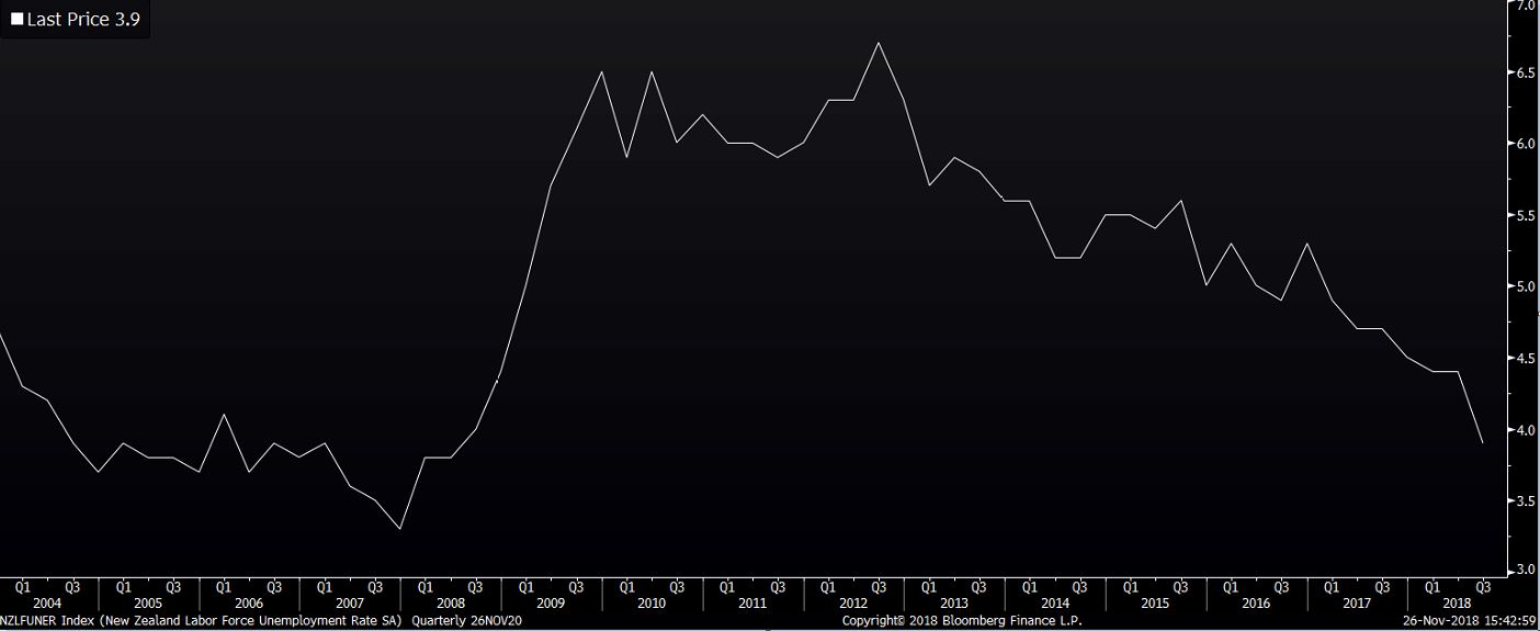Novozélandský dolár je charakteristický nedostatkom fundamentov. Takmer všetky dáta sú zverejňované na kvartálnej báze, čo znamená menej volatility poháňanej fundamentmi. Čo sa týka posledných týždňov, tak najlepšie číslo, ktoré z novozélandskej ekonomiky dorazilo, je nezamestnanosť. Tá klesla v treťom kvartáli nečakane silno zo 4,4% na 3,9%, čo dlhodobého pohľadu znamená, že už je len tesne nad predkrízovými úrovňami.