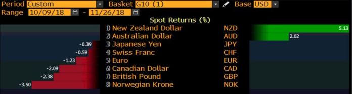 Spektrum mien G10 má od začiatku silnej averzie k riziku na trhoch (od 10.10) prekvapivého lídra. Je ním NZD, ktorý voči USD získal viac ako 5%. Prekvapivé je to z toho dôvodu, že NZD (a takisto aj AUD) patria medzi rizikovejšie meny, ktorým sa obvykle v čase negatívnej nálady na trhoch nedarí. Navyše, sú veľkými exportérmi do Číny, ktorej ekonomika vo veľkej miere aj kvôli obchodnej vojne s USA spomaľuje.