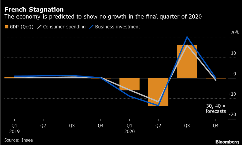 Podľa odhadov by sa mal rast Francúzskej ekonomiky v Q4 2020 zastaviť. Očakáva sa, že tvrdšie opatrenia na zabránenie šírenia koronavírusu v krajine utlmia investície a spotrebu. Zdroj: Bloomberg