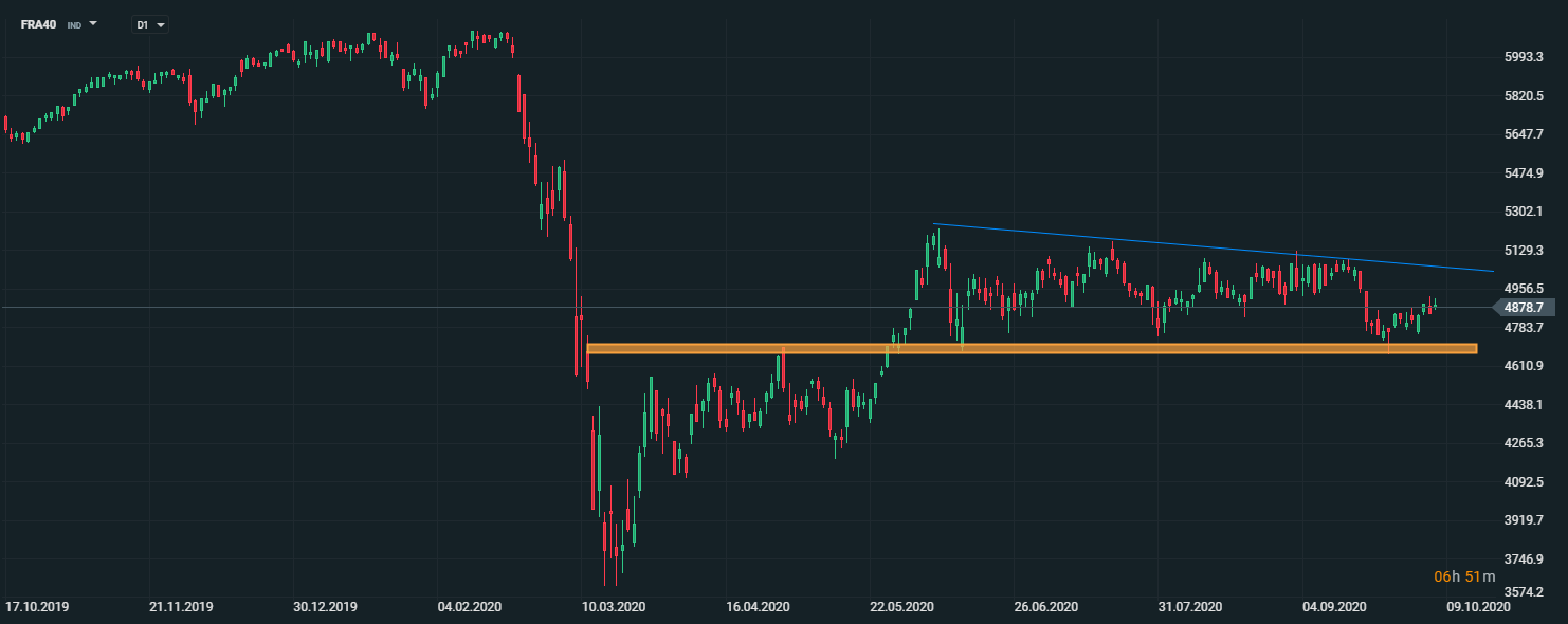 Francúzsky akciový index CAC40 (FRA40) sa obchoduje v klesajúcom trojuholníkovom vzore. V prípade, ak sa ekonomická situácia v krajine zhorší, akciový index môže testovať support okolo úrovne 4680 bodov. Zdroj: xStation5