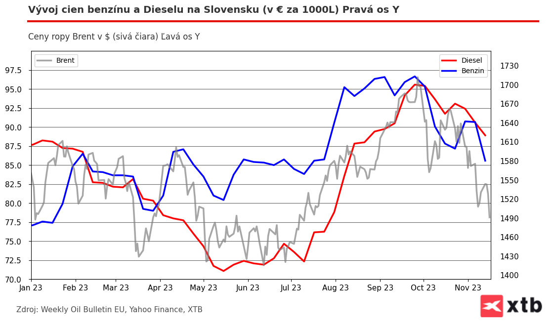 Za týmto poklesom stojí pokles cien ropy v posledných dvoch týždňoch. Tento vývoj pripisujem hlavne negatívnejším makroekonomickým dátam o exporte prichádzajúce z Číny.. V 45. týždni sa tak cena ropy potápala o 4,07 %. Takýto trend však pokračuje ešte aj tento týždeň s ďalším poklesom o 4,06 %. V súčasnosti za týmto poklesom nestojí žiaden významnejší údaj, a tak je tento pokles spojený hlavne s negatívnym sentimentom na trhu s ropou. Aktuálna cena ropy brent je 78,13 dolárov, avšak jeho budúci vývoj spojený s vysokou volatilitou na trhu ostáva neistý