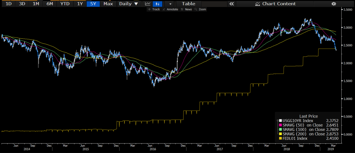 Výnos 10-ročných amerických dlhopisov (sviečkový graf) a efektívna úroková sadzba FEDu (zelený čiarový graf). Zdroj: Bloomberg
