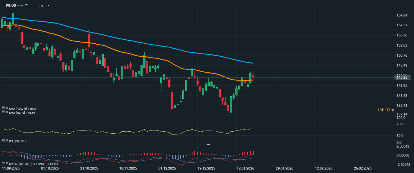 Akcie spoločnosti Procter & Gamble sa aktuálne obchodujú na úrovni 145,86 USD, čím testujú rezistenciu v podobe kĺzavého priemeru EMA 50 (145,19 USD). Rastový pohyb, ktorý začal v prvej polovici januára, vrátil akcie nad krátkodobé technické bariéry, ale trend zostáva klesajúci, ako naznačuje naďalej klesajúci SMA 100 (148,97 USD). RSI sa posunul na 52,7 bodu, teda nad neutrálnu zónu, čo naznačuje zlepšujúce sa momentum, ale zároveň nenaznačuje prekúpenosť. Krátkodobo bude rozhodujúce, či sa akcie udržia nad EMA 50 – prípadné potvrdenie tohto prerazu by mohlo otvoriť cestu k otestovaniu SMA 100 a psychologickej úrovne 150 USD. Naopak, neúspešný preraz nad pásmo 146–148 USD by mohol viesť k návratu smerom k úrovni 140 USD.