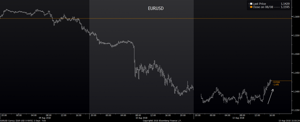 Situace v Turecku se v průběhu dne stabilizovala po víkendových útočných slovech prezidenta Erdogana, že turecká ekonomika byla zrazena a trumpovy cla byly dýkou do zad. Turecká centrální banka dnes provedla první záchranné kroky – snížila povinné rezervy pro banky, nicméně trh je ve formě dalšího propadu liry rychle posoudil jako nedostatečné. Lira tak zatím drží většinu ztrát, které nabrala od pátečního výplachu. Pár USDTRY se pohybuje okolo 6,9 liry za dolar a EURTRY okolo 7,9 liry za euro.